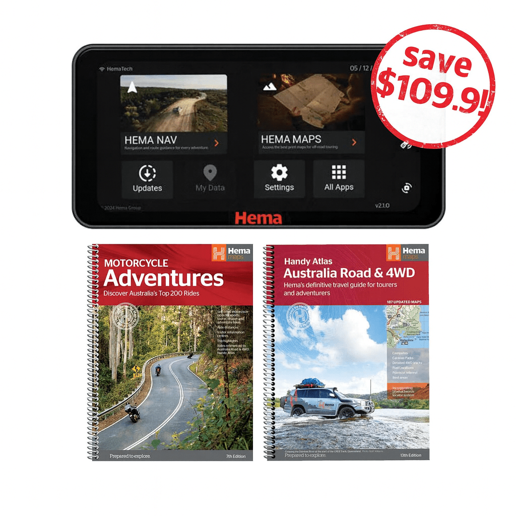 Discover Australia’s best rides and routes with the Hema Maps HX-M1 Motorcycle GPS Navigator Adventure Bundle, the ultimate companion for motorcyclists and 4WD explorers. Designed for riders who live for the open road, this premium bundle combines cutting-edge navigation with expert trip inspiration and detailed paper mapping — giving you everything you need to plan, ride, and explore with confidence.